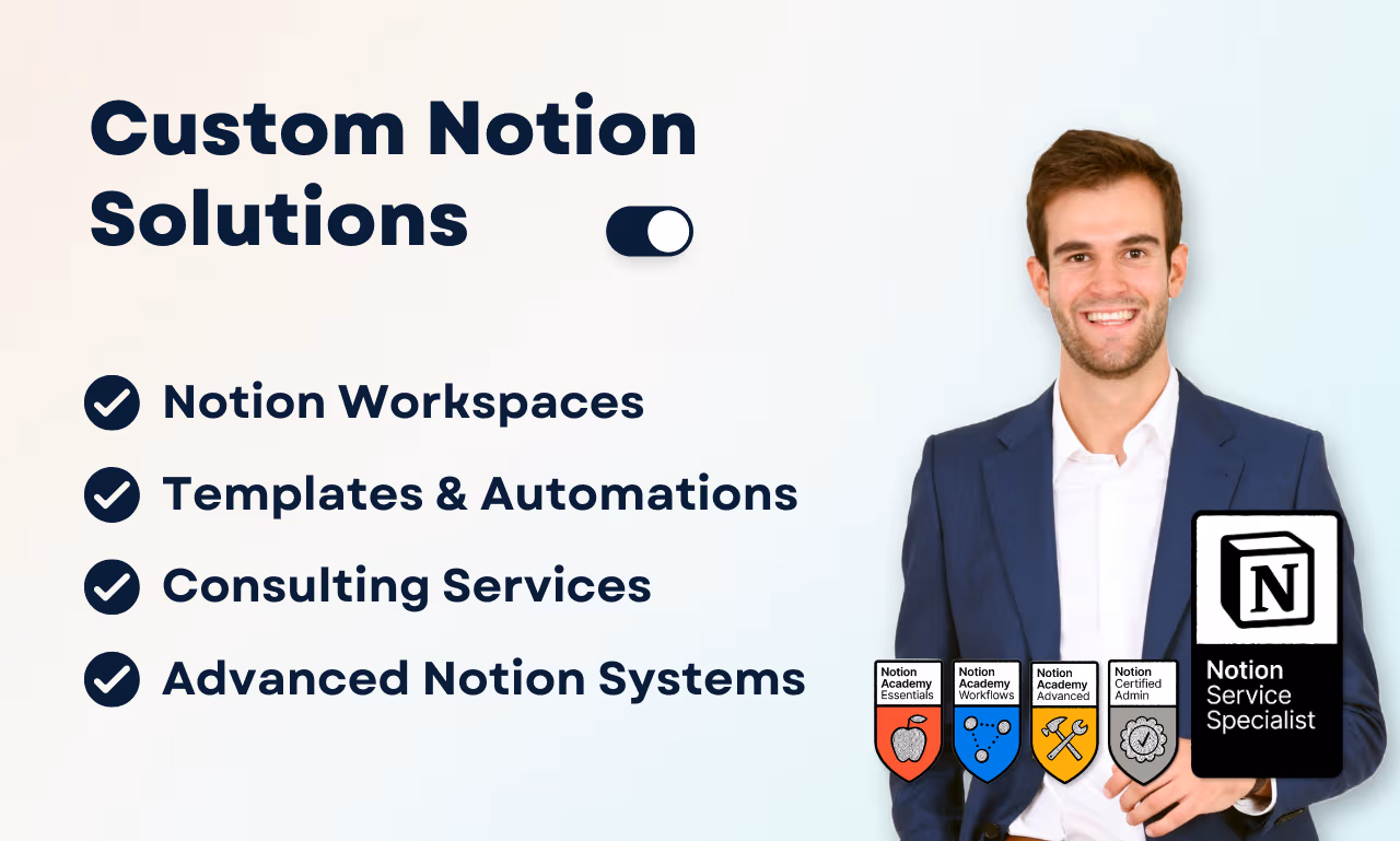 Elevate your business with strategic Notion solutions tailored to high-value projects. I analyze your goals, processes, and challenges to design a Notion ecosystem that enhances decision-making and operational clarity. From startups to enterprises, my consulting delivers scalable systems that drive measurable results.Notion System Optimization & Support