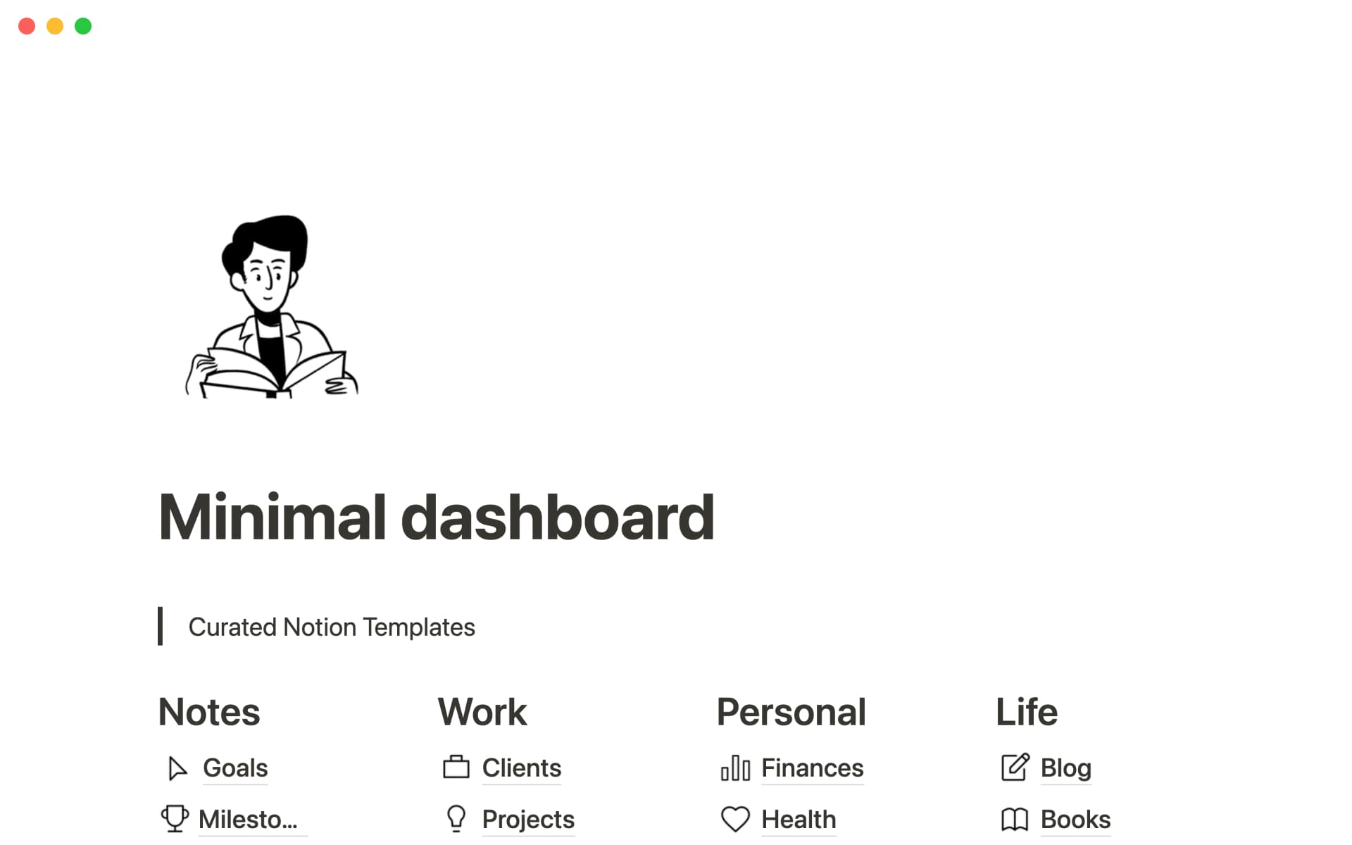 Having one place to house your projects, notes, and goals is key to staying organized in everything you do. But building a dashboard for yourself doesn't have to be complicated or overwhelming. Use this template as inspiration for categorizing the different areas of your life, then watch your new digital home grow with you over time. It's easy to add sections or subpages for your specific topics of interest too â that new knitting hobby of yours definitely deserves its own space.