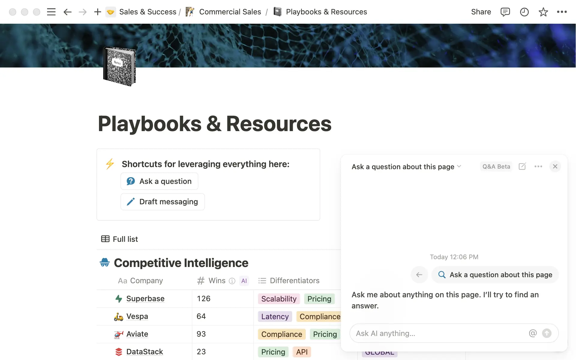 The sales team also leverages Notion to maintain up-to-date knowledge of complex technical details and industry information. With their technical documentation and internal enablement materials centralized in Notion, team members can access everything they need in one place and quickly answer customer questions during calls. They also use Notion AI to craft targeted, effective prospecting messages in seconds that synthesizes the latest knowledge from across their workspace and other tools connected to it.